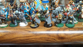 Getting the basic paint scheme up there... Grey armor, Brass/Copper trim and Red for the Shoulder Pad... Stripped and repainted lead minis are coming along well. Using Minwax to seal/give it some depth... Seems like it is coming along well...